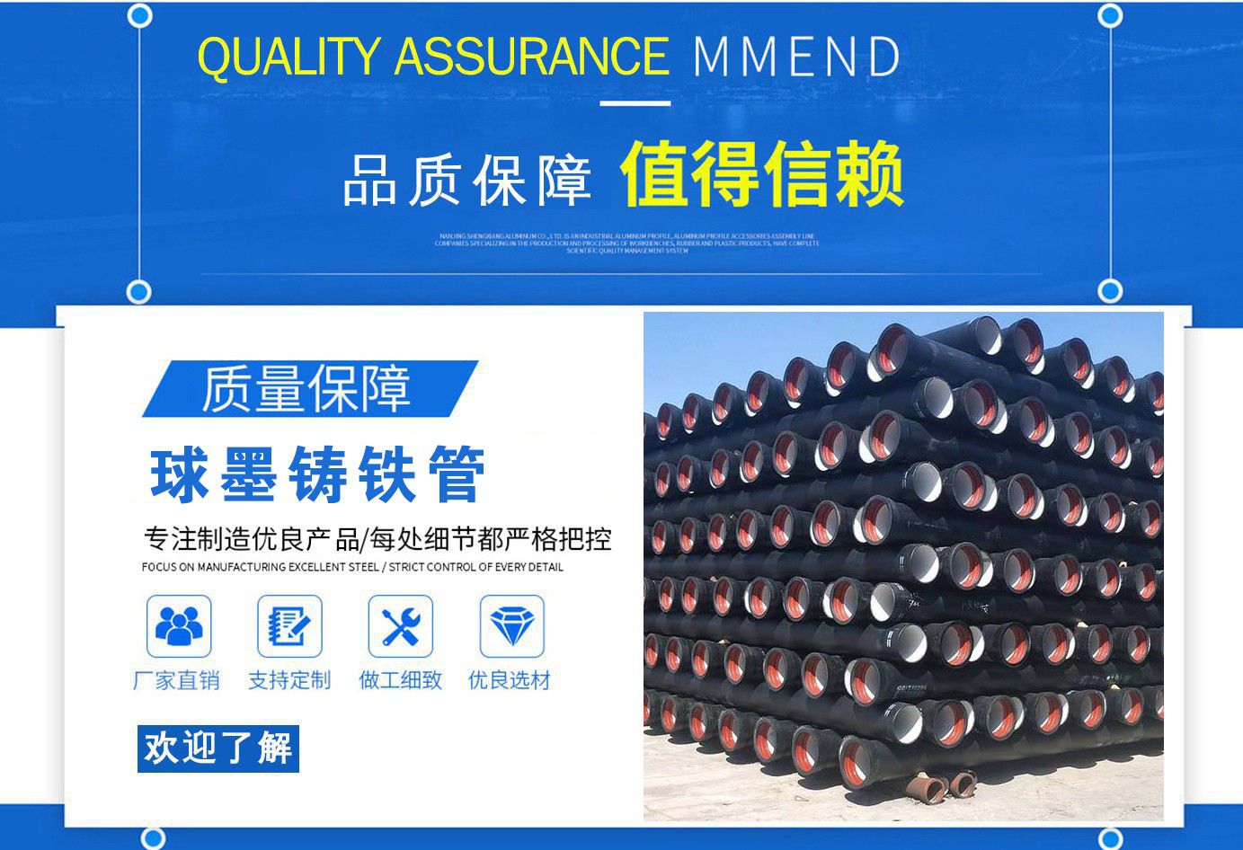 山西飛翔鑄業(yè)有限公司是一家以新興技術(shù)致力于研制開(kāi)發(fā)、生產(chǎn)、銷售、施工安裝各種球墨管廠家,球墨鑄鐵管價(jià)格,國(guó)標(biāo)球墨管,k9球墨鑄鐵管,國(guó)標(biāo)球墨鑄鐵管,離心球墨鑄鐵管等系列鑄鐵產(chǎn)品。公司擁有完善的銷售、售后服務(wù)體系及一支由鑄造專家、工程師組成的精通產(chǎn)品設(shè)備和生產(chǎn)鑄造的技術(shù)力量隊(duì)伍。隨著企業(yè)的發(fā)展,我們積累了豐富的鑄造經(jīng)驗(yàn)與科技水平。使得產(chǎn)品具有高強(qiáng)度、高韌性、耐腐蝕性強(qiáng)等性能。同時(shí),我們獲得質(zhì)量管理體系認(rèn)證、產(chǎn)品質(zhì)量認(rèn)證、職業(yè)健康體系認(rèn)證、環(huán)境管理體系認(rèn)證。產(chǎn)品暢銷各地并打入韓國(guó)、新加坡等東南亞市場(chǎng)。 在未來(lái)的發(fā)展中,公司奉行誠(chéng)信共雙贏,合作創(chuàng)盛世的企業(yè)理念。讓我們一起共創(chuàng)美好未來(lái)!  公司產(chǎn)品采用良好的工藝流程,以確保產(chǎn)品質(zhì)量的穩(wěn)定性:以良好的設(shè)備,確保質(zhì)量的可靠性。廣泛應(yīng)用于國(guó)內(nèi)外城市的市政建設(shè),通信,自來(lái)水,消防,園林,環(huán)保等行業(yè),產(chǎn)品大獲贊譽(yù)!  我們有多年的井蓋生產(chǎn)經(jīng)驗(yàn),多名老技術(shù)工人有將近二十年的生產(chǎn)經(jīng)驗(yàn),還聘請(qǐng)多名新技術(shù)研發(fā)人員,因?yàn)槲覀兪冀K堅(jiān)信質(zhì)量才是未來(lái)生存的根本,只有把質(zhì)量保證了,企業(yè)才會(huì)有更加美好的未來(lái)。公司堅(jiān)持用心服務(wù),誠(chéng)信為本,與時(shí)俱進(jìn),科技為先的企業(yè)理念,堅(jiān)持科技先導(dǎo)、竭誠(chéng)為廣大用戶服務(wù)。歡迎各界朋友蒞臨我公司參觀,指導(dǎo)洽談業(yè)務(wù),相信選擇我們就是選擇我們共贏的明天...